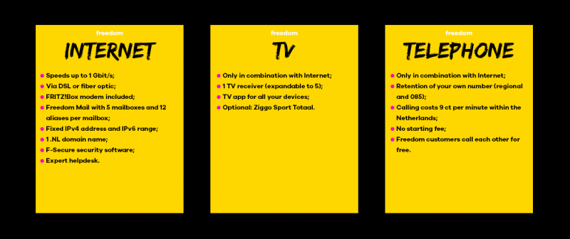 Freedom goes further than just offering internet, TV and telephone. Freedom stands for an open and safe internet and believes that it should be accessible to everyone. We are working hard on this (together with other parties). When you choose Freedom, you are not only choosing internet access, but also online security, privacy and a very helpfull helpdesk.