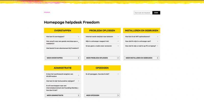 Vorige week gaven we al aan dat het goed gaat met Freedom. We groeien hard, maar dat betekent ook dat het aantal klanten dat ons vragen stelt groeit. Het aantal medewerkers op de helpdesk groeit relatief minder hard dan het aantal vragen dat bij ons binnenkomt. De ticketstanden nemen daarom toe. De oude helpdeskpagina’s hielpen niet echt bij het verminderen van vragen, omdat het ontbrak aan een logische structuur waardoor het lastig was de juiste informatie te vinden. We zijn dan ook erg blij te kunnen melden dat de helpdeskpagina's volledig vernieuwd zijn.